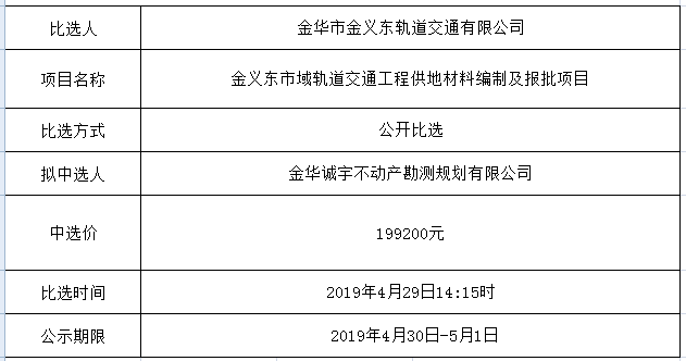 金華市金義東軌道交通有限公司運營2026-2027年度活動實施服務(wù)機構(gòu)框架協(xié)議項目中標(biāo)候選人公示