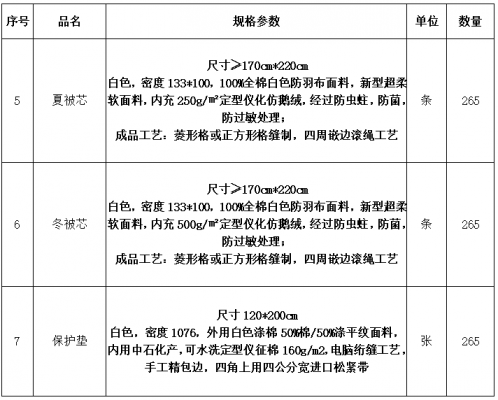 三、用戶需求書中附件1《司機公寓床品需求明細表》序號5、序號6、序號7規(guī)格參數(shù)修改如下,其余未修改項仍按原比選文件執(zhí)行: